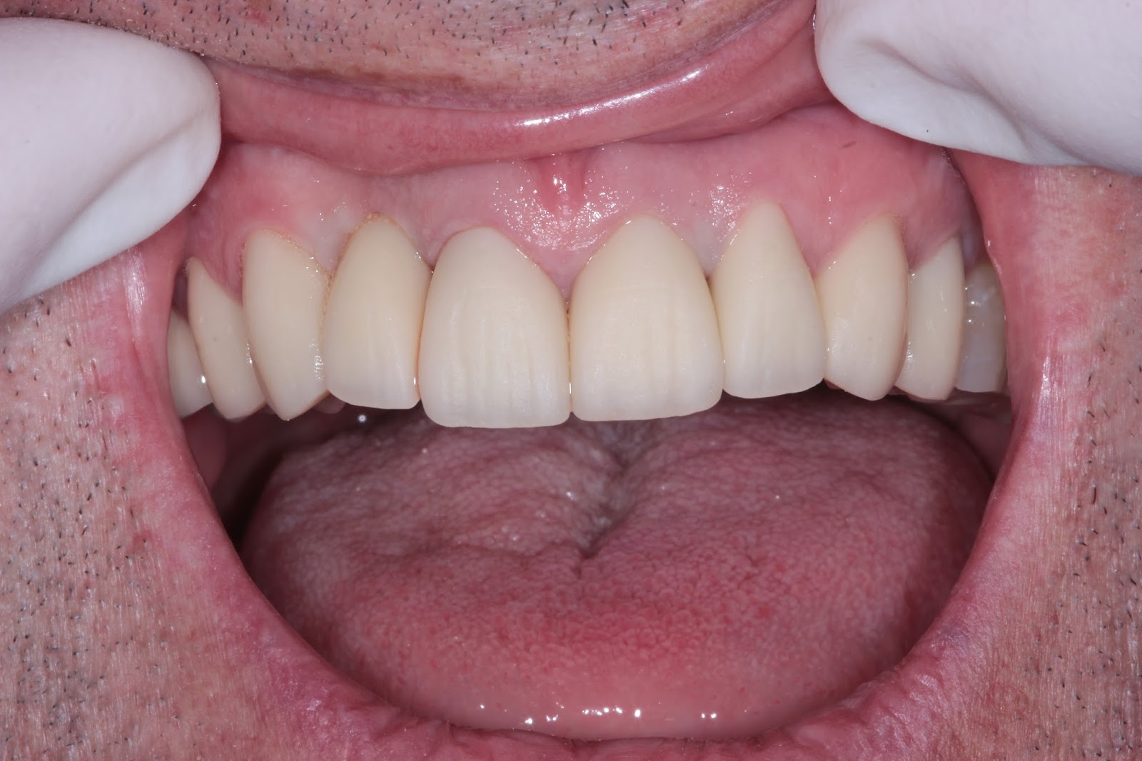 Wenn man nun versucht, "normale" Zahnlängen zu rekonstruieren, geraten die Kronen unter den Belastungsdruck der Unterkieferfront. Folge sind Abplatzungen der Keramik, die sich so lange fortsetzen, bis die funktionelle Zahnlänge erreicht ist oder die Kronen komplett zerbrechen. Nach meiner Meinung liegt hier ein fundamentaler Planungsfehler vor, der auch von keinem Zahntechniker kompensiert werden kann.