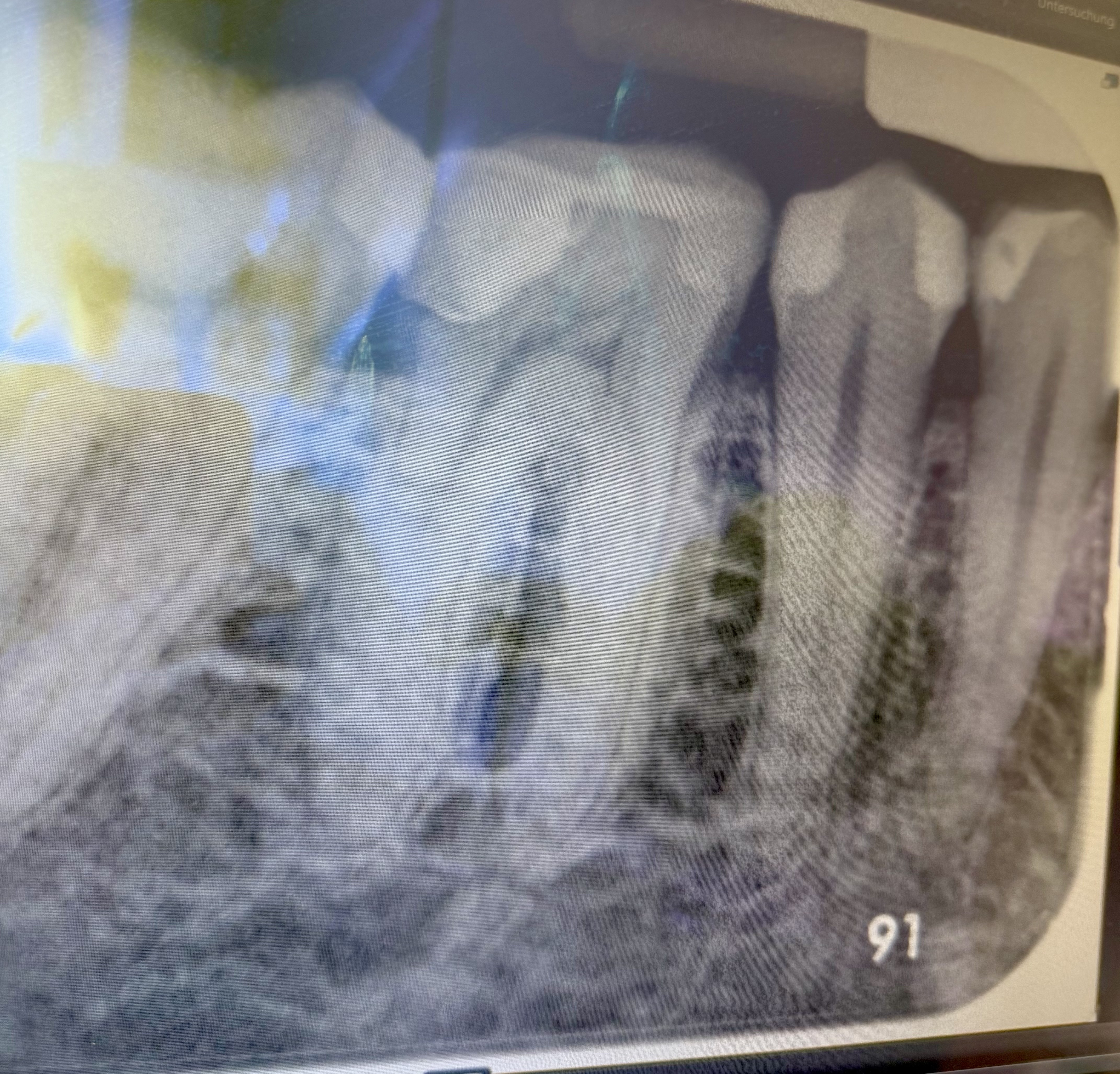 - Ganz klar entzündete Wurzel. Wurzelkanalbehandlung durch die Krohne und dann danach wieder verschließen.